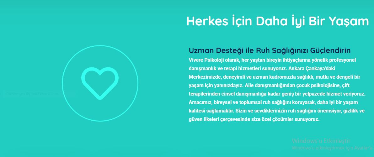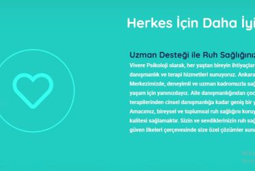 Çocuk, ergen ve yetişkinlere özel danışmanlık programlarının yanı sıra ailelere yönelik rehberlik hizmetleriyle de danışanlarının yanında olan vivere psikoloji, bireylerin hayat kalitesini artırmayı ve sağlıklı ilişkiler kurmalarını desteklemeyi amaçlar. Güçlü referansları, güvenilir çalışma prensipleri ve etik değerlere bağlılığıyla Ankara’da psikolojik danışmanlık alanında öncü bir merkezdir.
